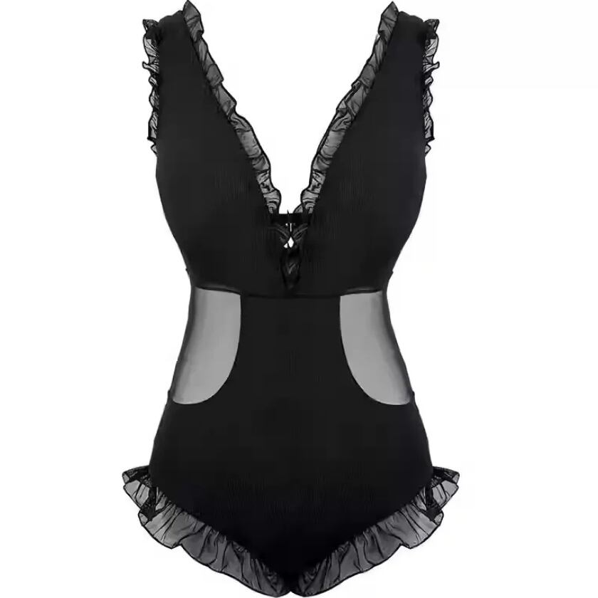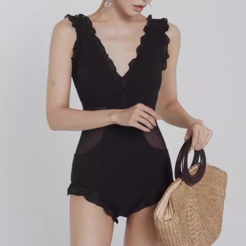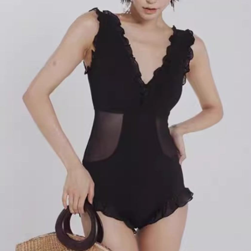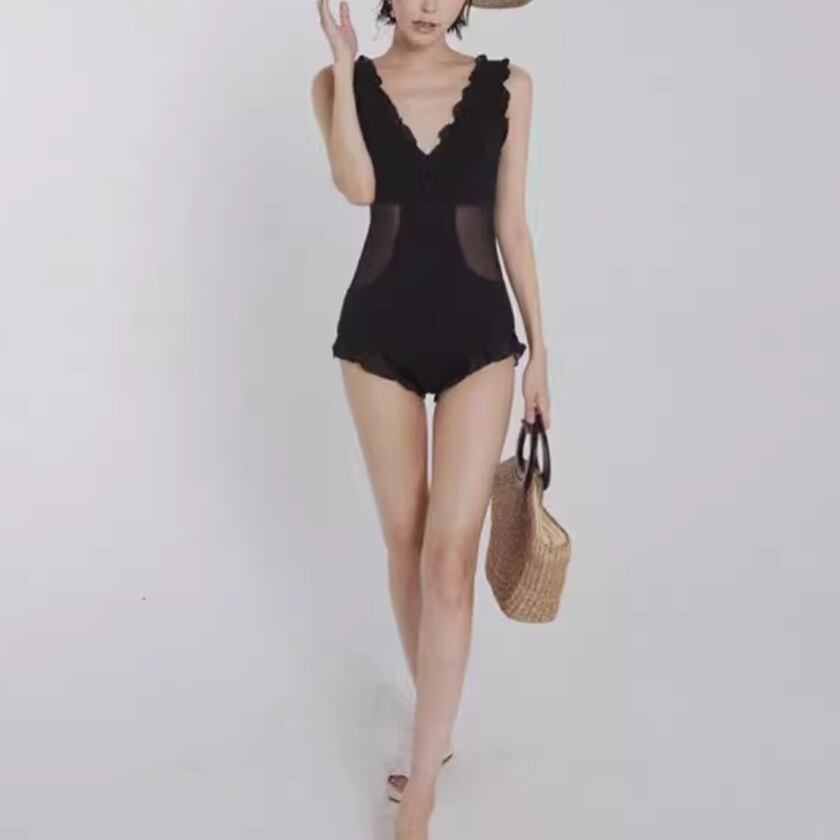 シンプルながらも、Vネックとフリル、メッシュの組み合わせが絶妙なワンピース水着です