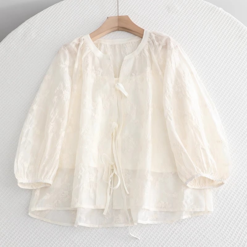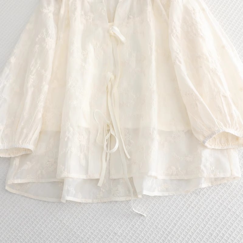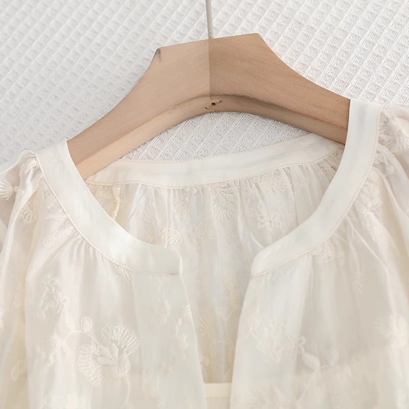 刺繍とリボンの、肌なじみがよく優しげな柔らかいブラウス