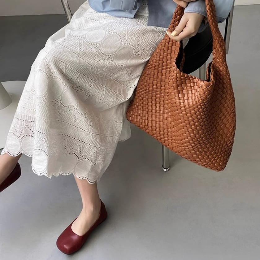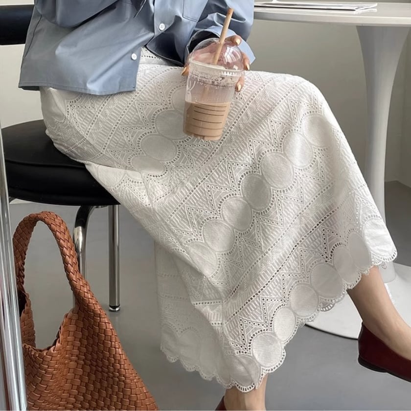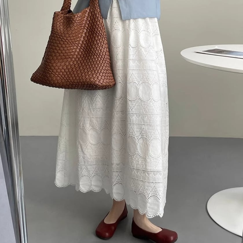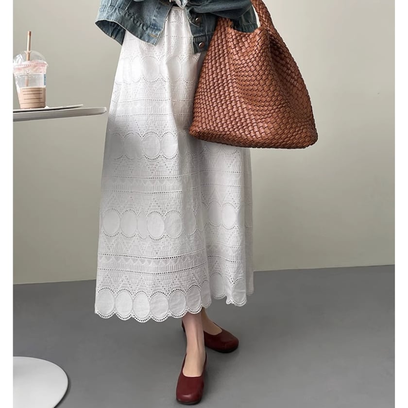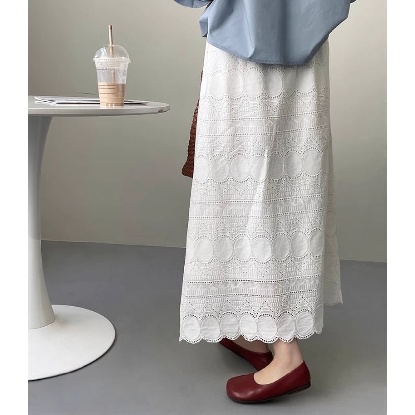 アイレット刺繍がポイントの、Aラインシルエットが美しいロングスカート