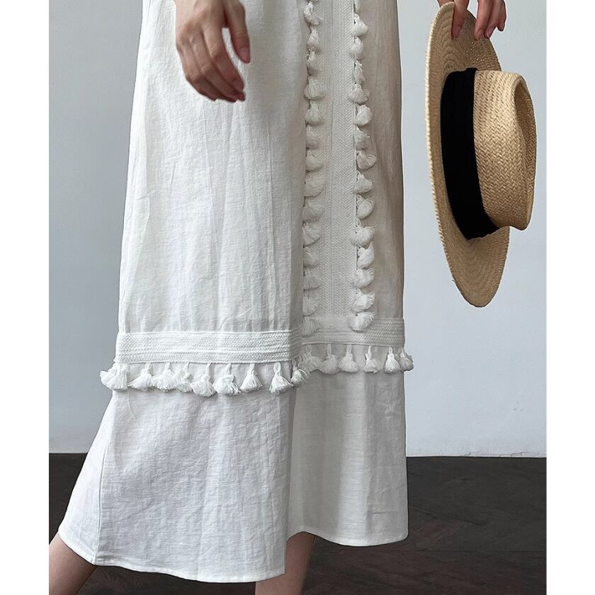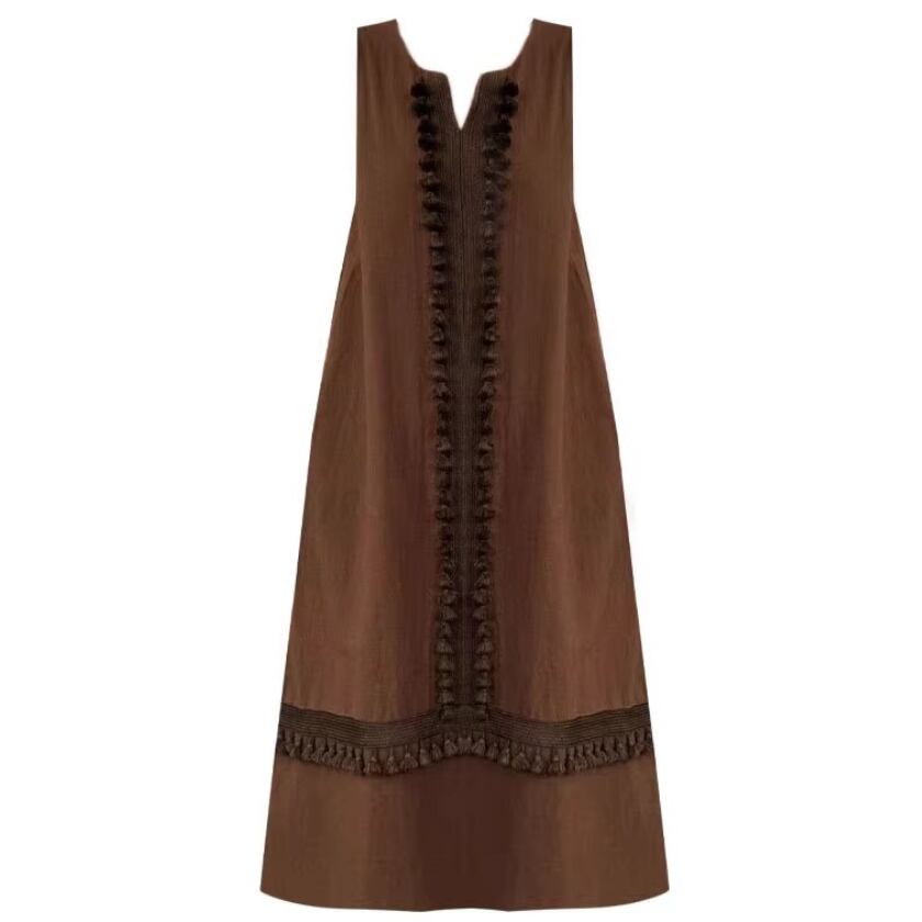 落ち着いた色合いと、タッセルデザインが上品さを演出するAラインのマキシワンピース