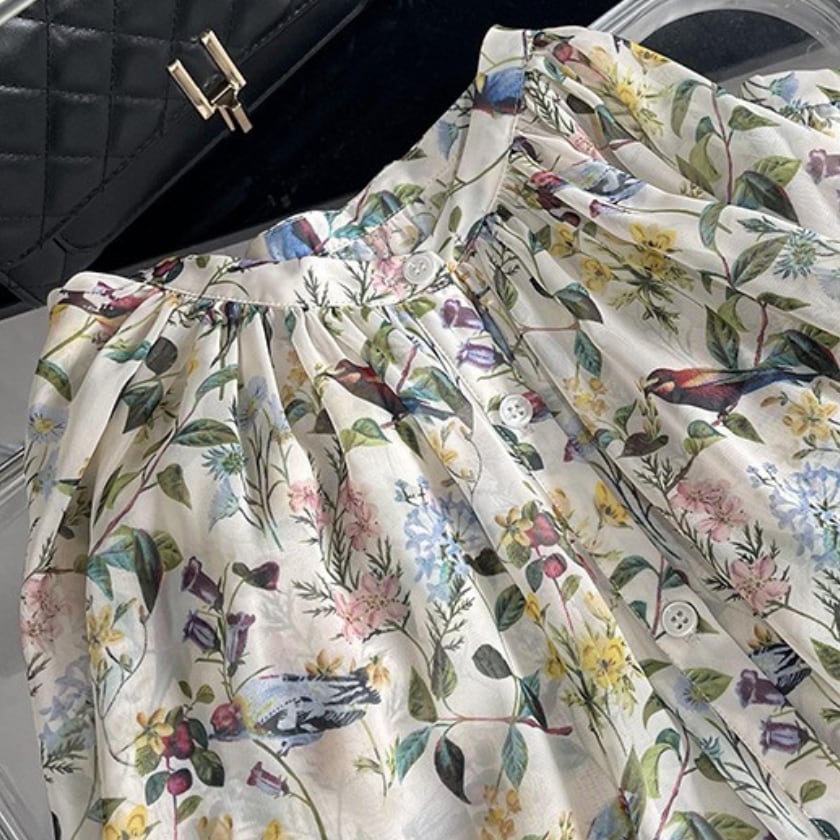 華やかながらも落ち着いた色合いの花柄が、着るだけで明るい印象を与えてくれます