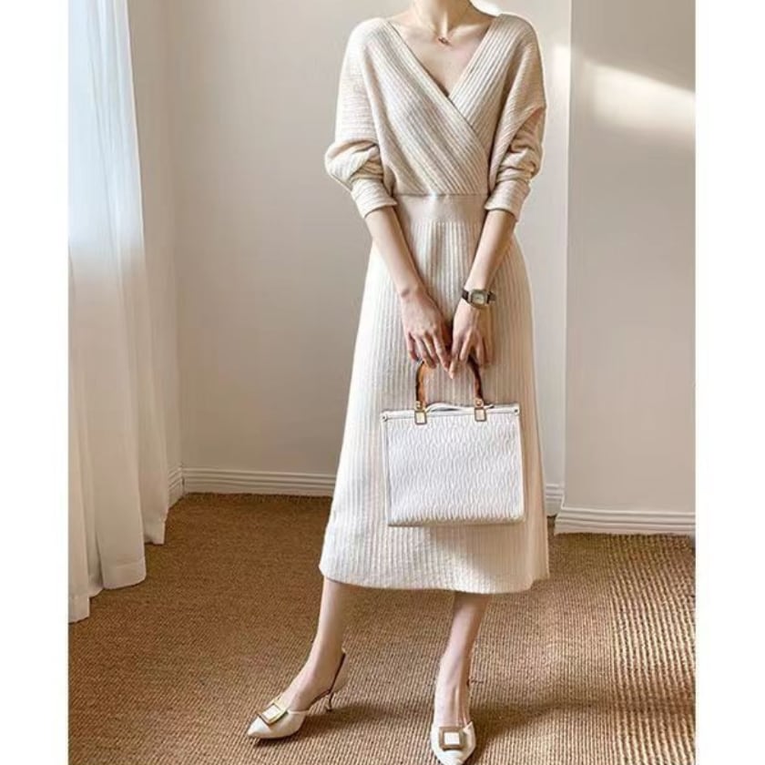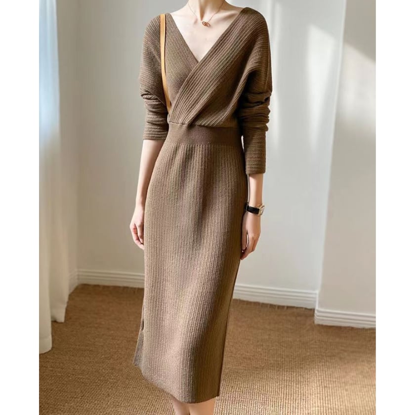 着るだけで洗練された印象を与えてくれる、カシュクールニットワンピースです