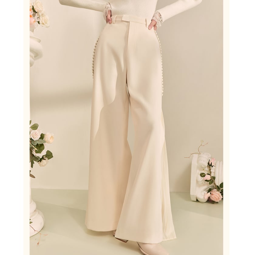 両サイトのボタンとシアー生地が個性的なワイドパンツ