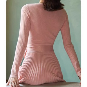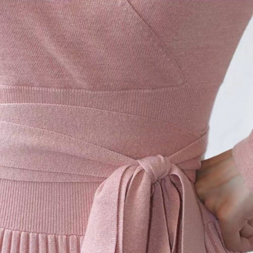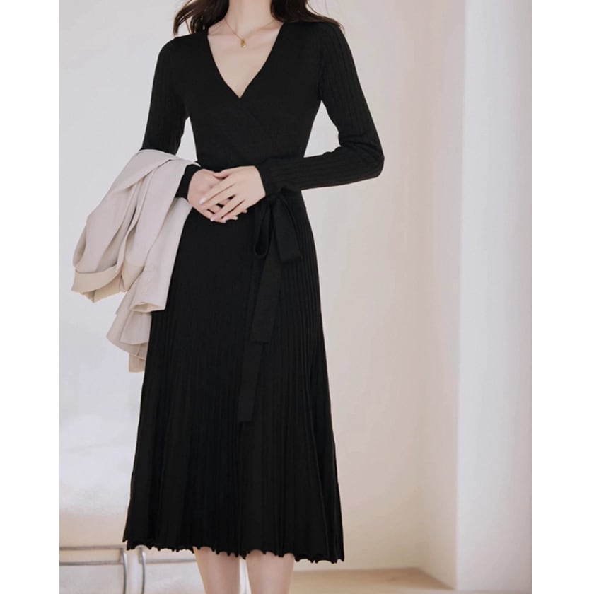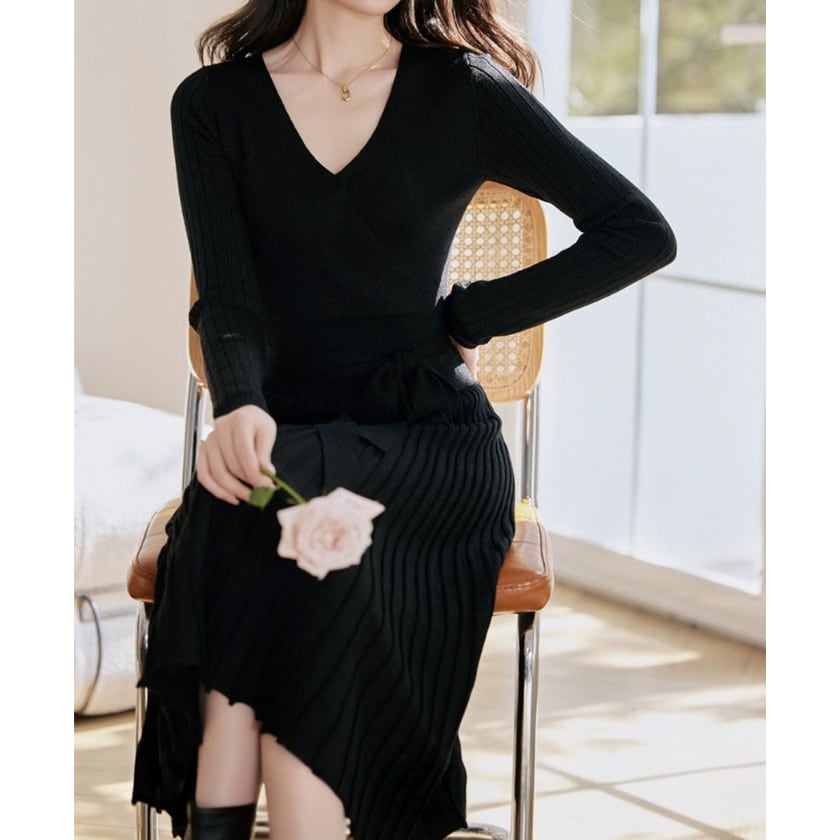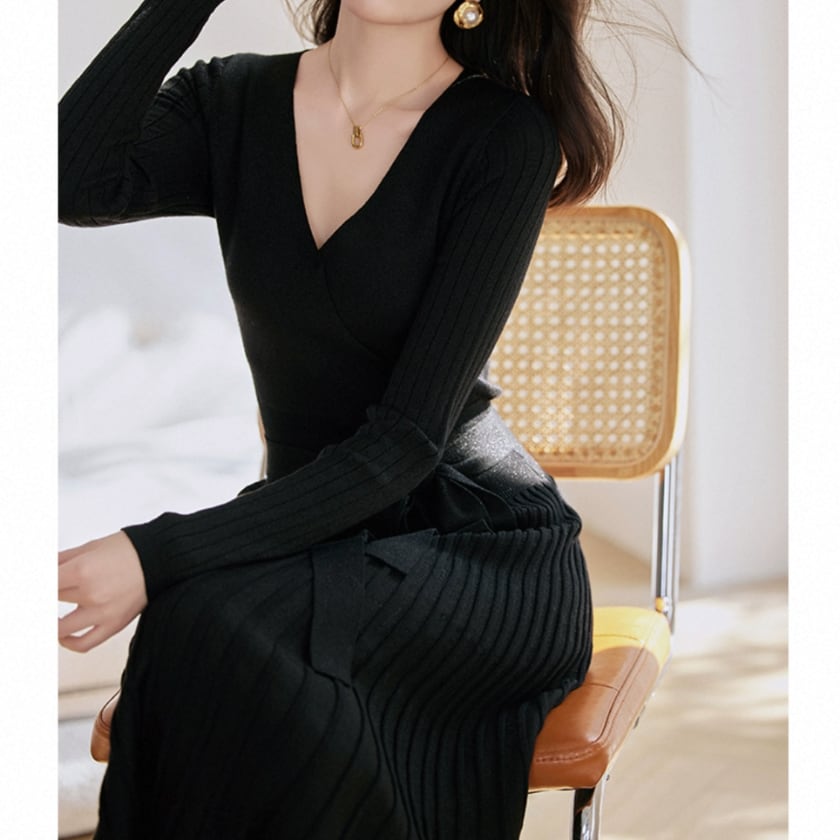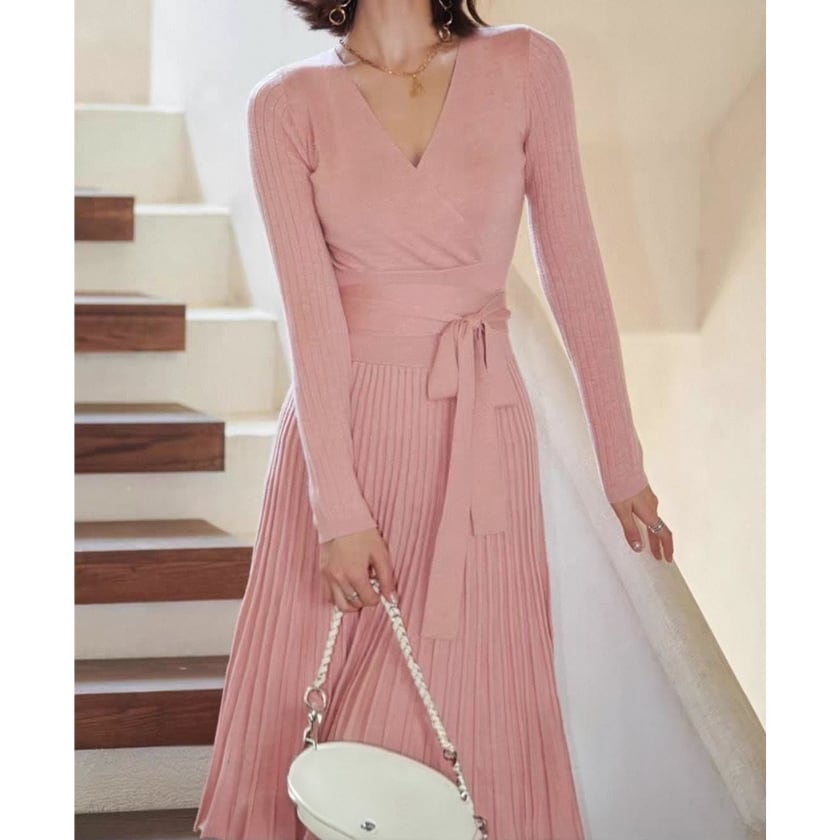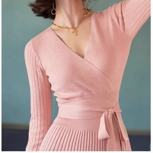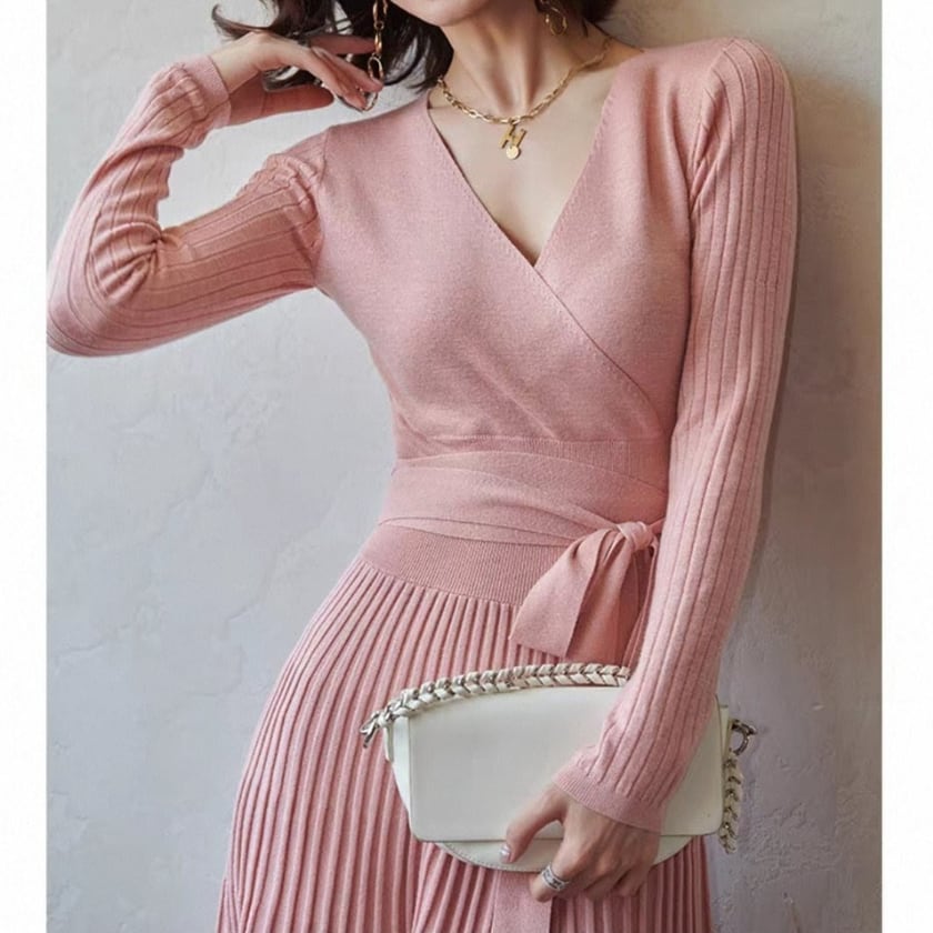 2col.ラップ風 ニットワンピース リボンベルト S0336