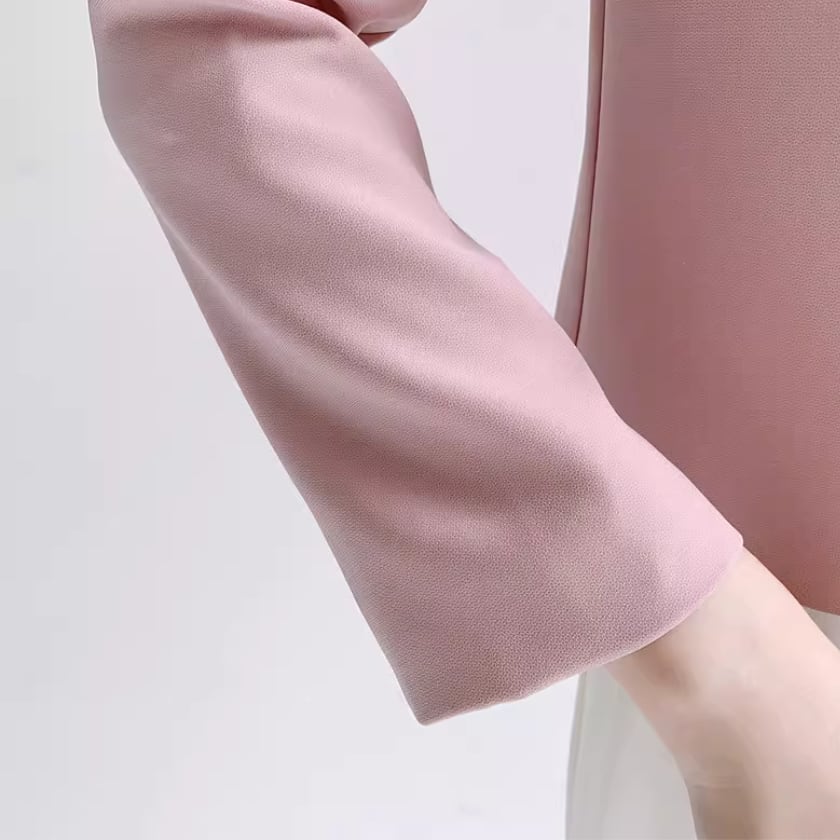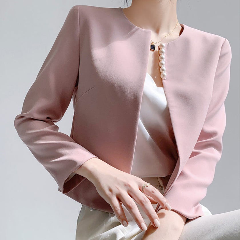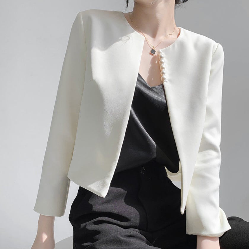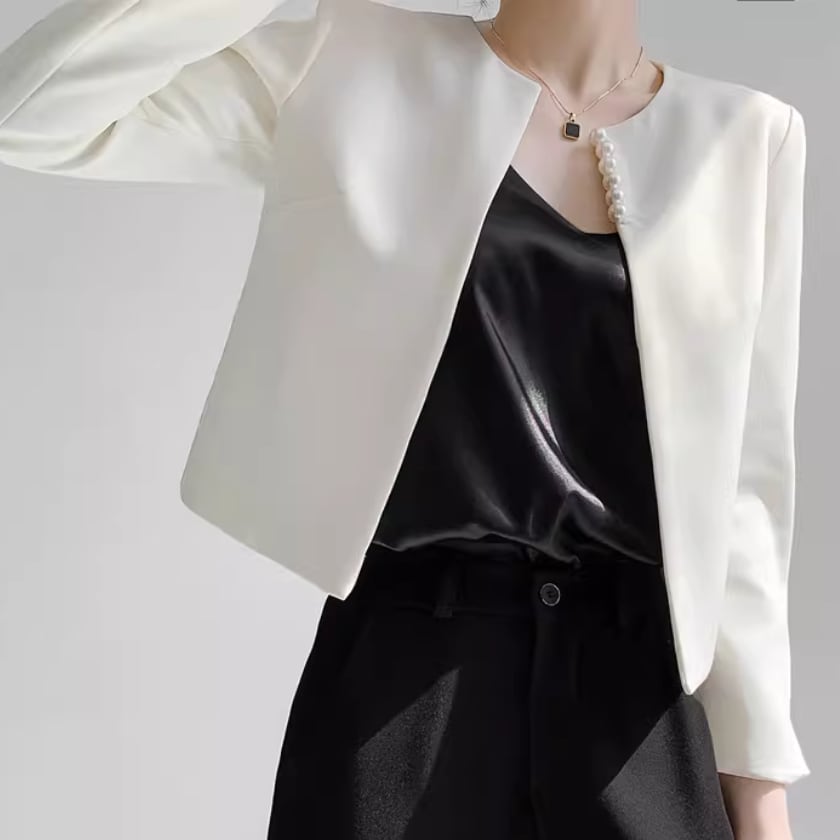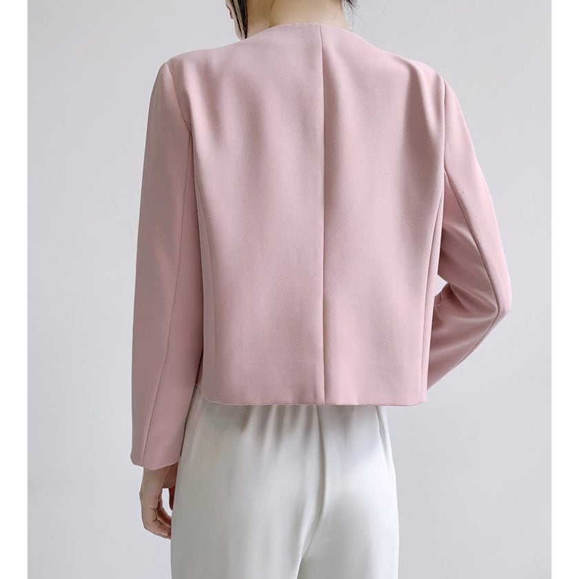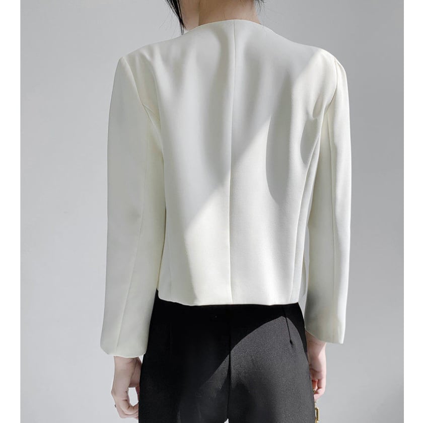 ノーカラーのデザインが、首元をすっきりと見せてくれます