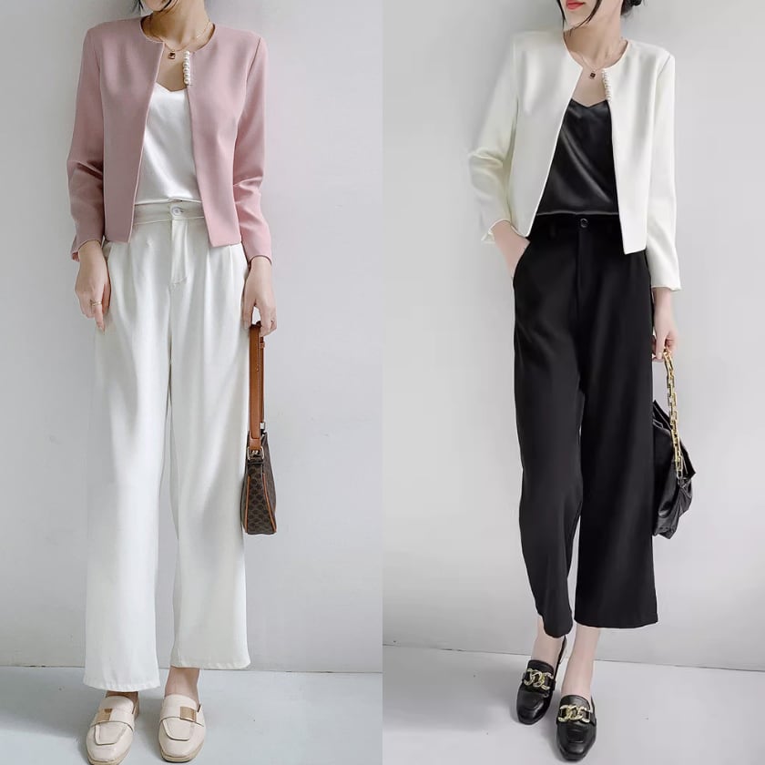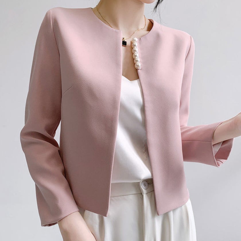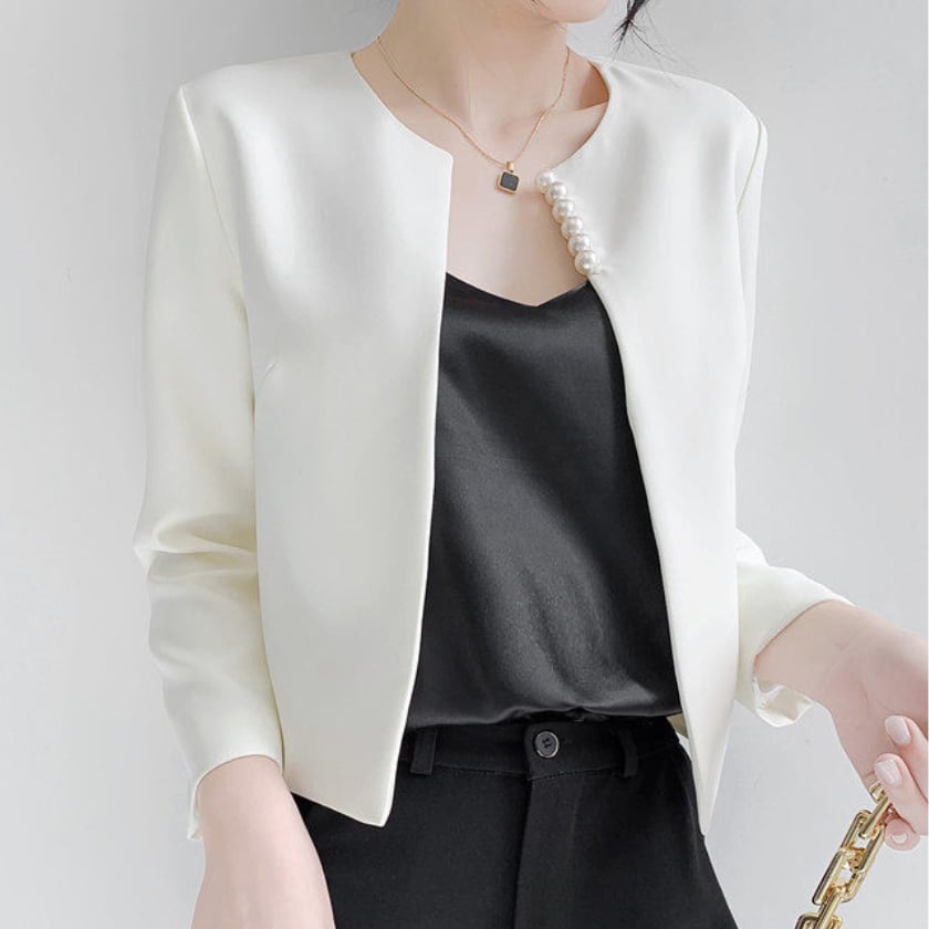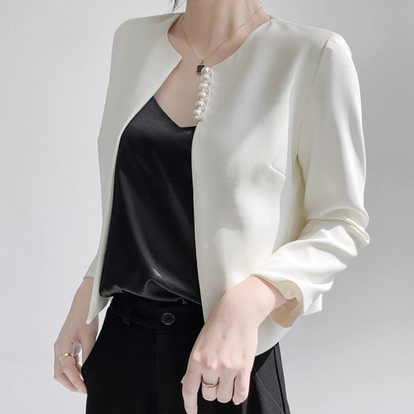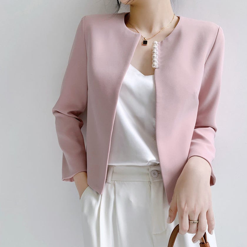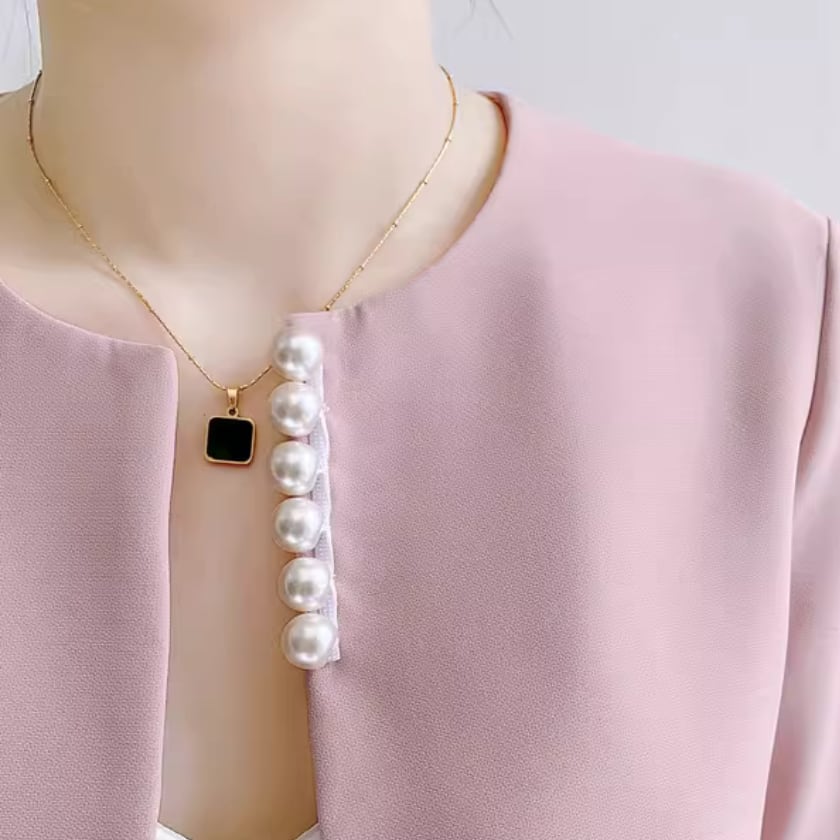パールの縁取りが上品さをプラスし、アクセサリーなしでも華やかな印象に◎