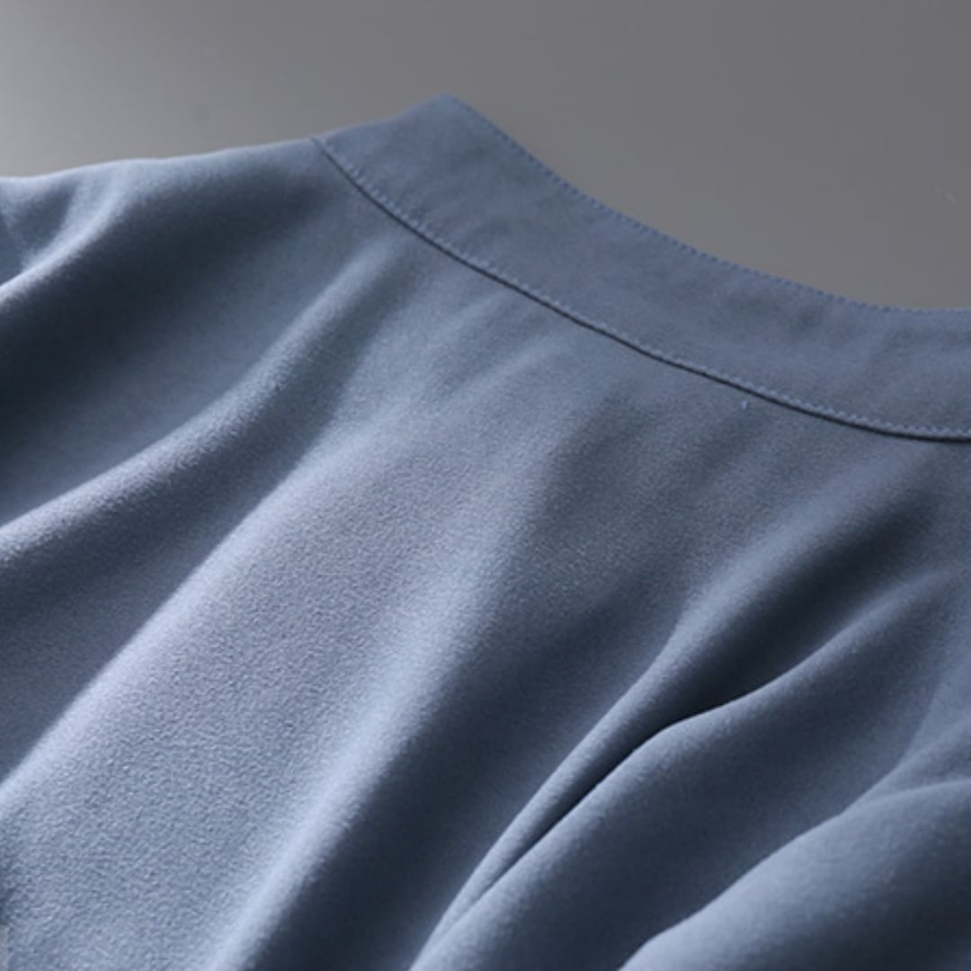 スタンドカラーが上品な印象を与え、さりげなく華やかさをプラスしてくれます