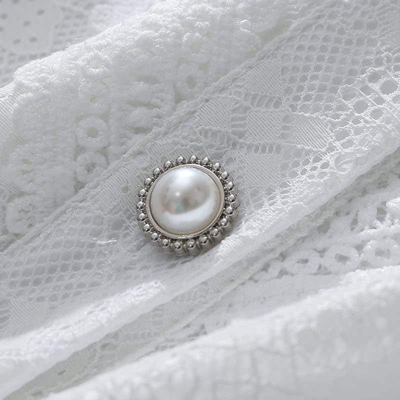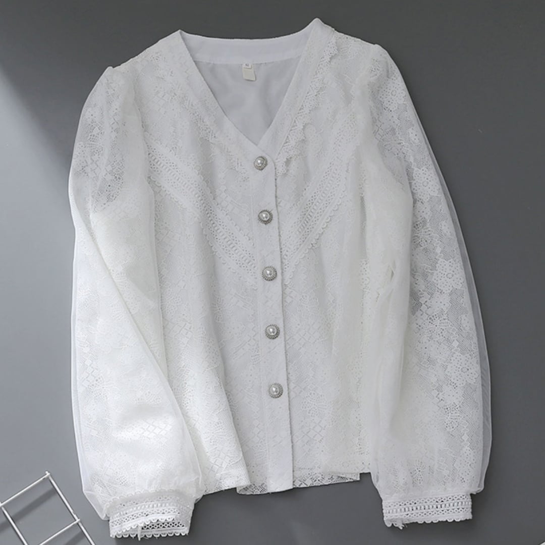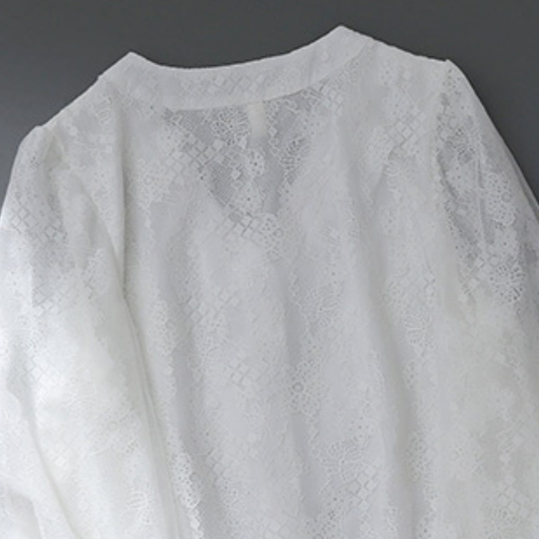 レトロな雰囲気漂うVネックレースシャツで、女性らしさと上品さを演出