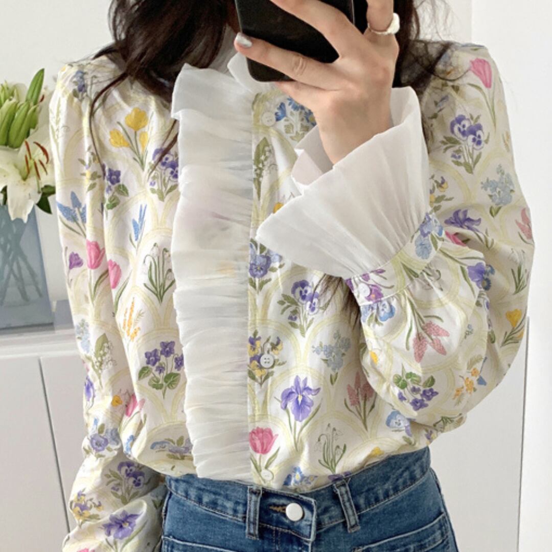 華やかな雰囲気が特徴のフリルフラワーシャツ