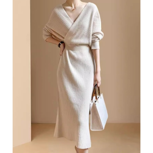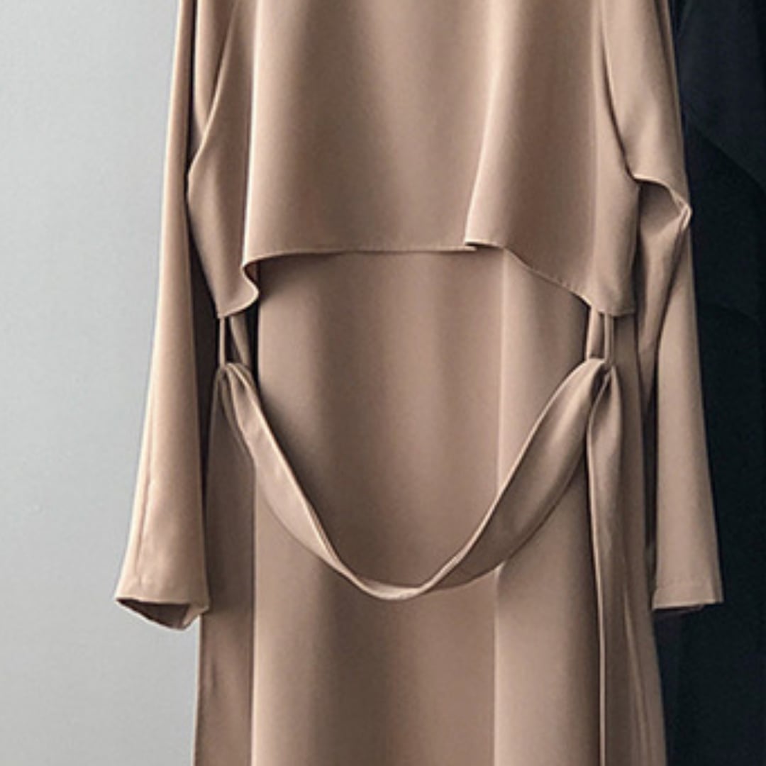 ヒップをカバーするミドル丈と美しいドレープデザインが、女性らしさを引き立たせます