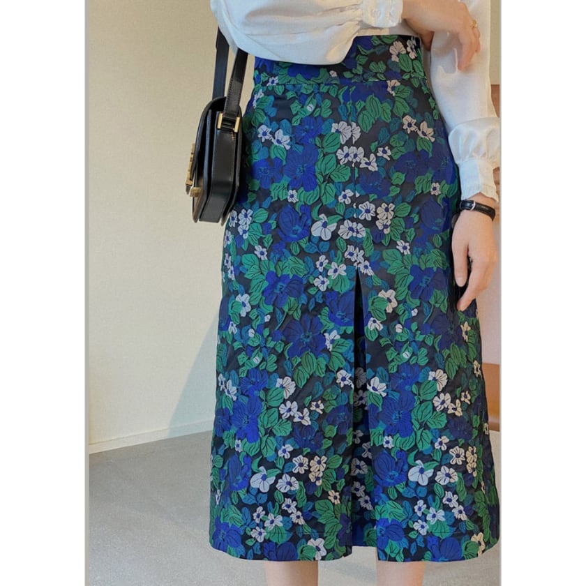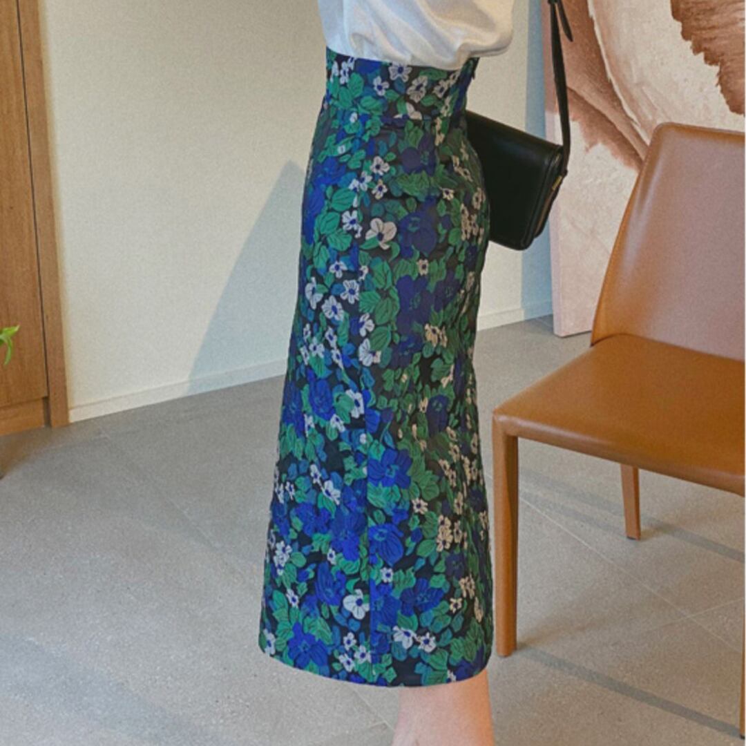 フロントスリットが歩くたびに女性らしい動きを演出するミモレ丈スカート。